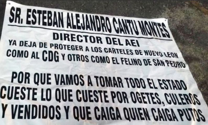 "Deja de proteger a los carteles de #NuevoLeón", Sicarios del #CJNG amenazan a director del #AEI de proteger al #CDG.https://t.co/IC8yNerQAY pic.twitter.com/5YC83dzCs2
